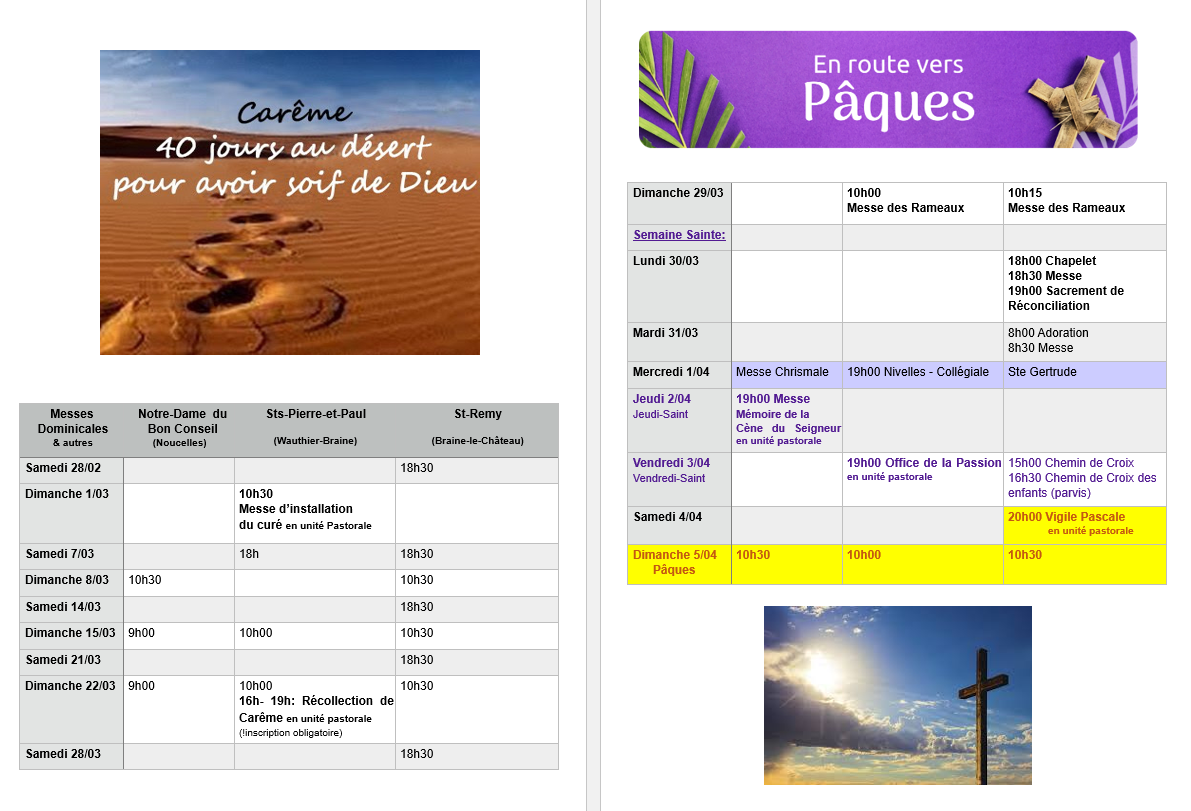 | Dimanche 16 novembre | 33è dimanche ordinaire | 10h30: Messe dominicale | 10h00: Messe dominicale | 9h00 : Messe dominicale | |